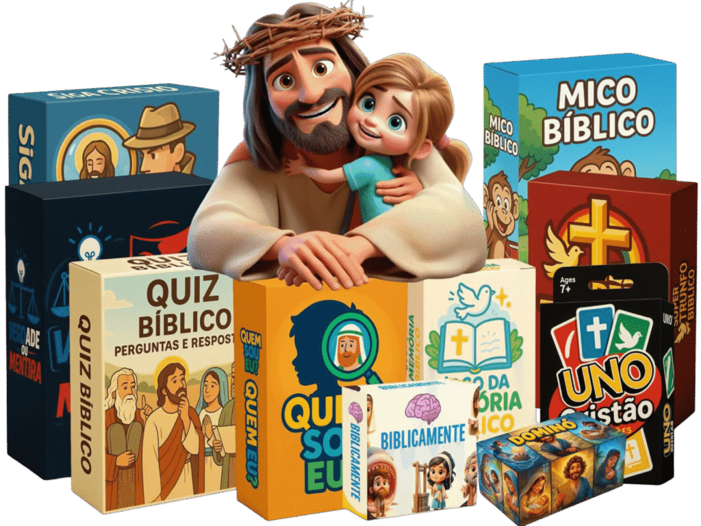 Fé Divertida — Kit 20 Jogos Cristãos é um pacote em PDF com 20 atividades prontas (cartas, cartelas, jogos de tabuleiro simples, quizzes e mais…